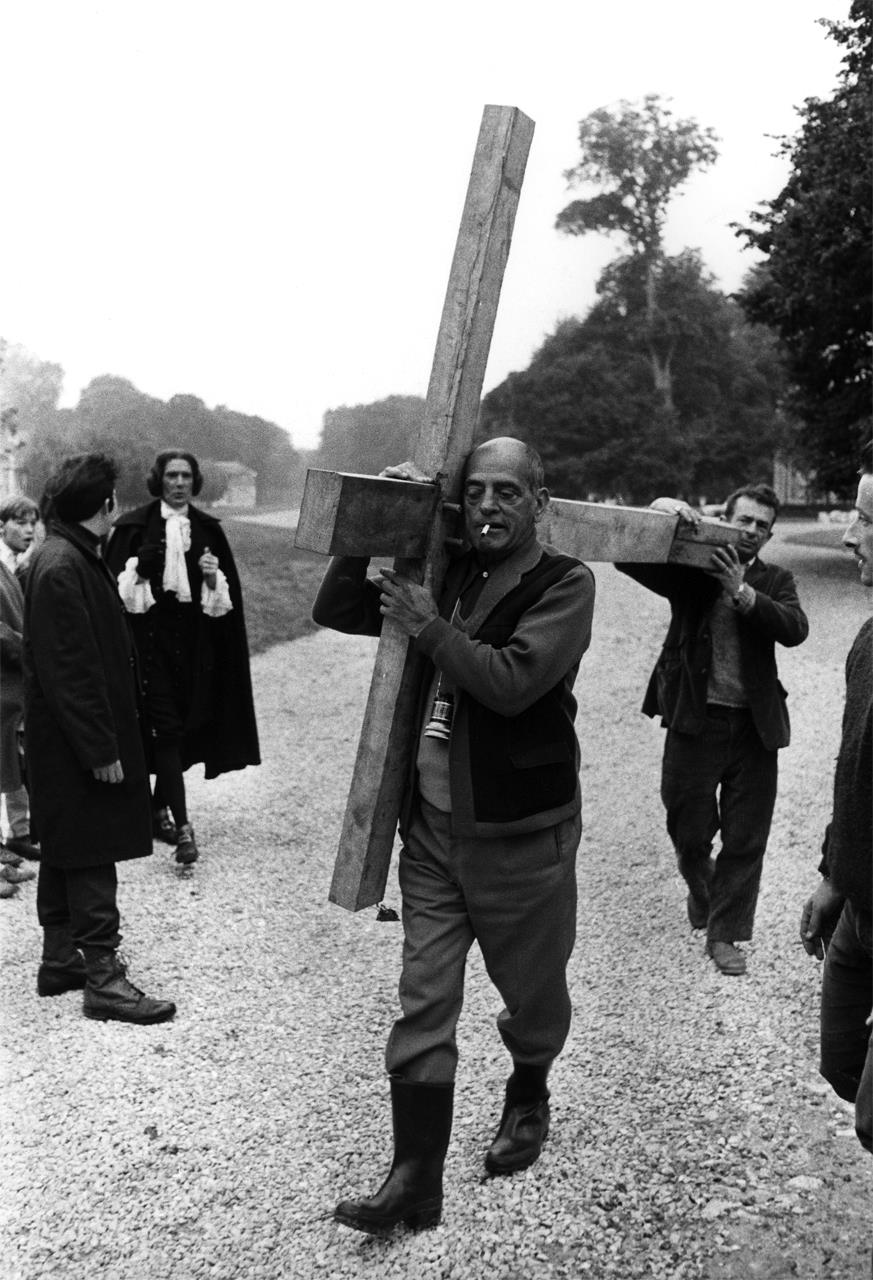 Luis Buñuel carrega a cruz no set de The Milky Way (1969), um filme, como tantos outros do realizador espanhol, que não demonstra grande apreço pela religião...